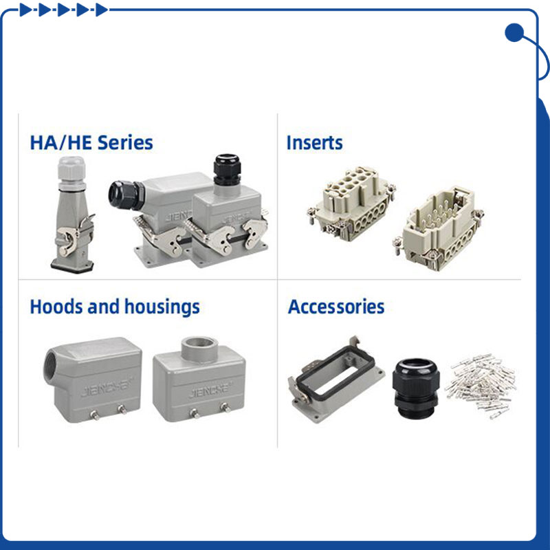 Каждый силовой разъем включает в себя вставки мужского и женского пола, контакты с винтом, контакты с боковым или верхним входным, корпус для переборки и кабельную железу.